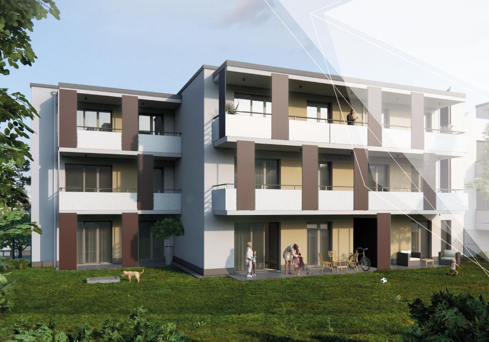 Das Objekt wird in Hanglage errichtet: Straßenseitig verfügt das Gebäude über einen ebenerdigen Zugang zum Untergeschoss, sodass die Tiefgarage, der Fahrradabstellraum, der Müllraum sowie die praktischen Kellerabteile direkt erreichbar sind. Rückseitig präsentiert sich das Gebäude mit ebenerdig gelegenen Erdgeschosswohnungen, die sich straßenseitig aufgrund der Hanglage im Hochparterre befinden.